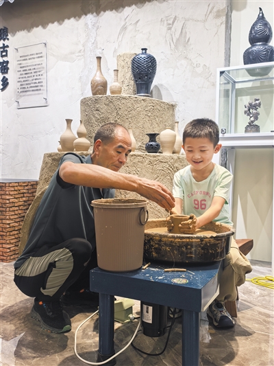 黑陶制作技艺传承人在教孩子制作黑陶作品。姜雯媛摄